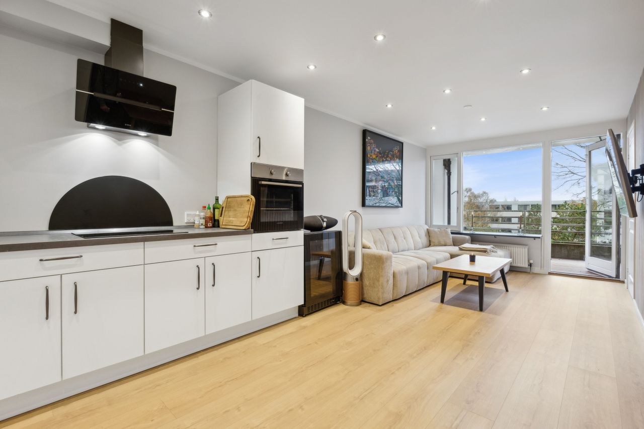 Indvendigt mødes du af et stilrent hjem renoveret i 2023. De 48 m² er gennemtænkte og klar til indflytning. Fra entréen træder du ind i en bolig med flotte gulve og moderne detaljer som spots i loftet og mulighed for etablering af vaskemaskine. Badeværelset har rainshower, væghængt toilet og lyse fliser, mens køkkenet smelter flot sammen med stuen og alrummet – ideelt til både hverdag og gæster. Det regulære værelse har en skøn udsigt til grønne omgivelser.
