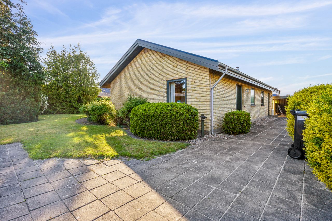 Haven bliver et frirum. Om sommeren kan terrassedøren stå åben hele dagen, for lige på den anden side har I en læfuld terrasse, og i forlængelse udfolder den solrige have sig med plæne, buske, bede og høj hæk. Endelig er der carport og isoleret skur på matriklen.