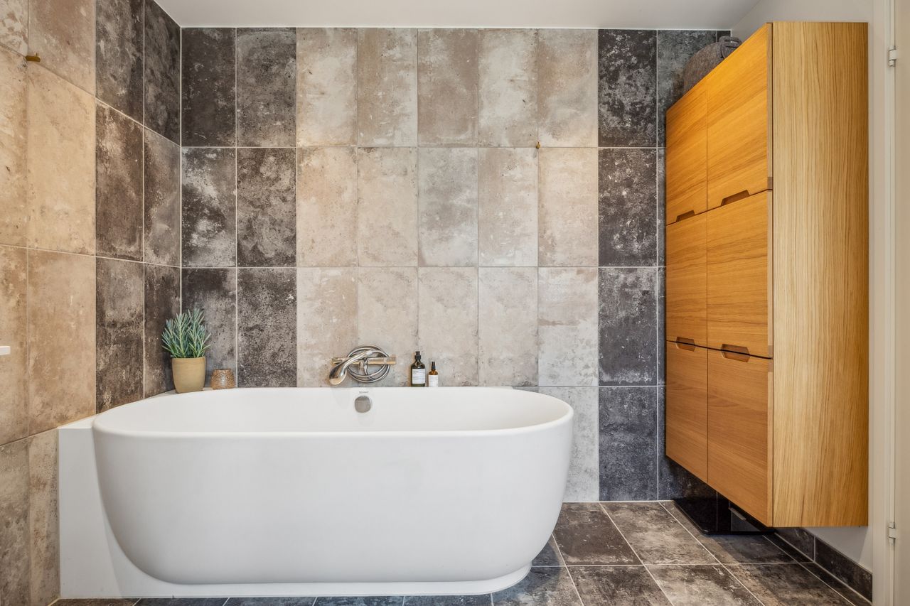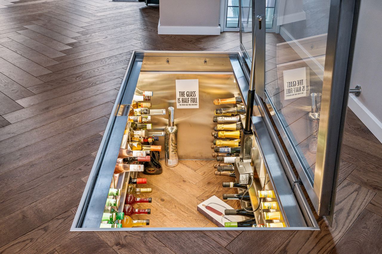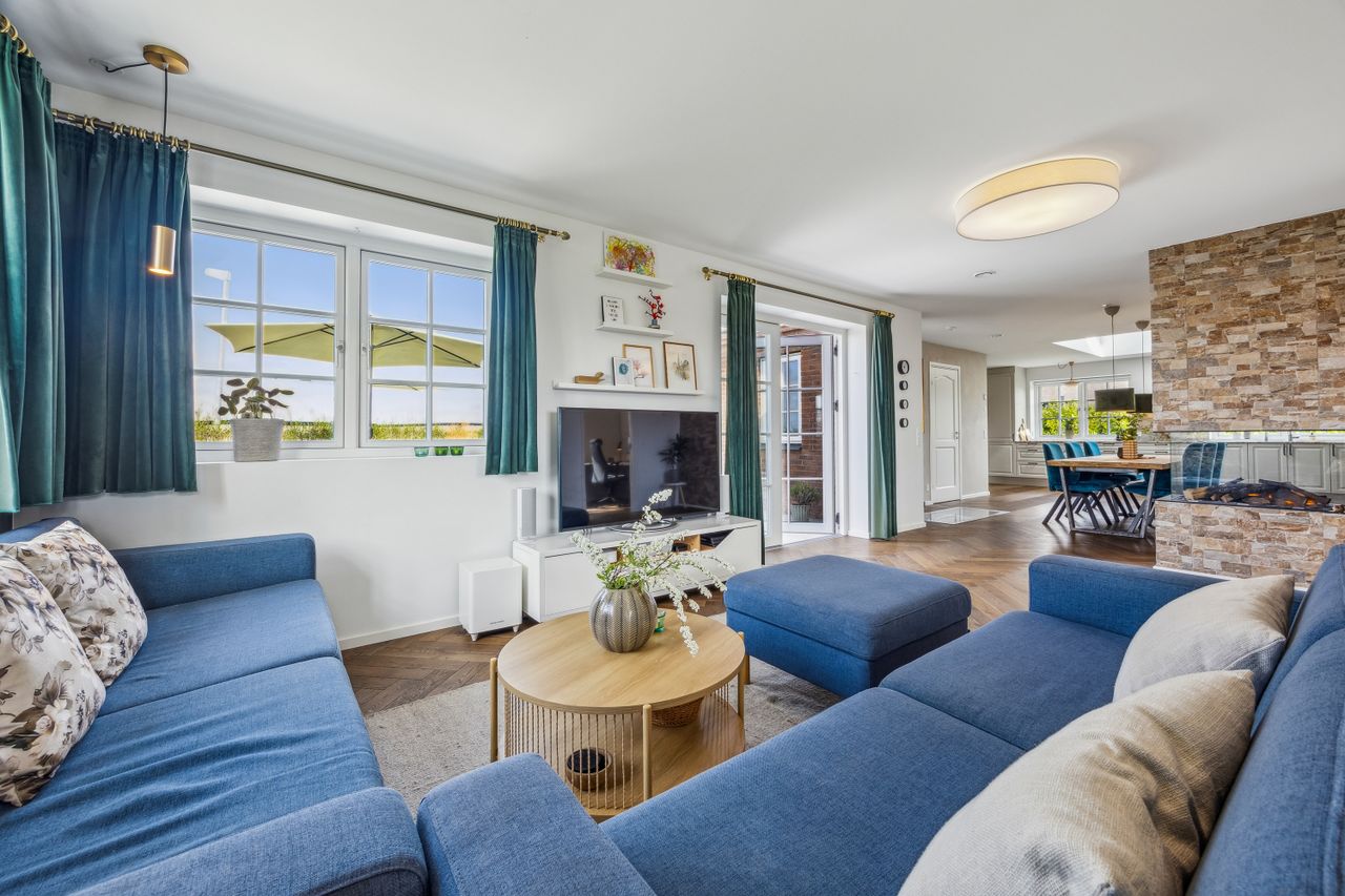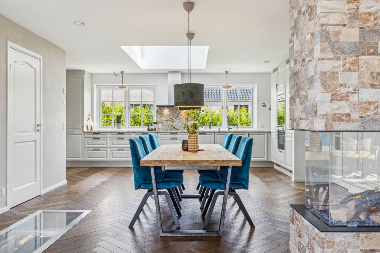 Køkkenet er et kapitel for sig. De lerfavede skabe og elementerne er fra HTH, og den smukke Quartzite-bordplade er varmeresistent. Alrummet har ovenlysvindue, vinkælder fra Vinorage og halvvæg med hybridpejs, der sikrer et behageligt indeklima.