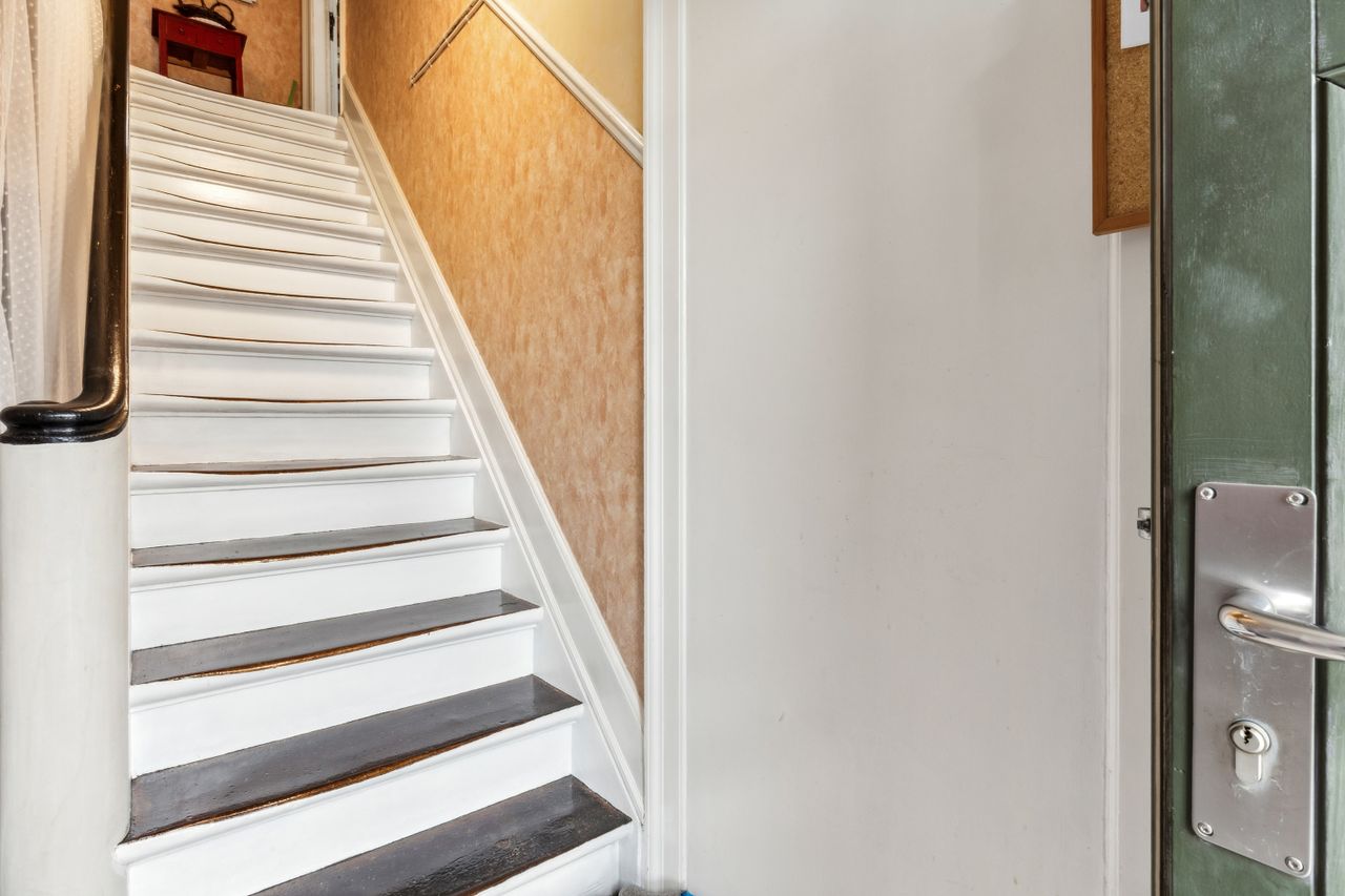 Den gode stemning følger med ind i andelsboligen, hvor de originale detaljer er værd at gå på opdagelse i. En flot trappe leder på fornem vis indenfor – trinene er glansfulde af slid, og det gør ikke noget, tværtimod. Du skal bevæge dig gennem flotte fyldningsdøre, gå rundt på klassiske plankegulve og bemærke nogle af de utraditionelle løsninger i boligen, der gør den så unik.