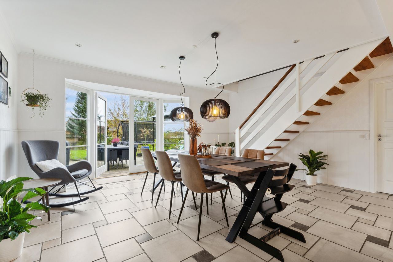Boligen er fordelt over to plan. I stueetagen ligger et bryggers med egen indgang, to værelser, et badeværelse og et stort køkken-alrum. Sidstnævnte må siges at være husets lysende hjerte, for her leder terrassedørene ud til den sydvendte have, og om sommeren kan fællesrummet forlænges ved at åbne op og lukke solen og varmen helt indenfor. Om vinteren er det ikke solen, men i stedet jordvarme under træ- og klinkegulvet, som står for opvarmningen. På førstesalen lokker en stor stue med to karnapper, og heroppe finder I yderligere to værelser – begge med nyligt udskiftede vinduer og det ene med walk-in – samt endnu et badeværelse.
