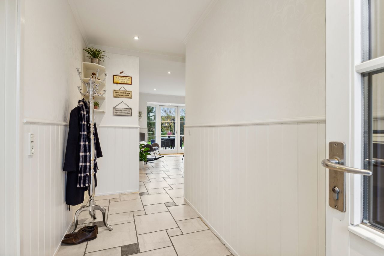 Udendørs råder grunden over et skur og en aflukket have med både et drivhus og en græsplæne med plads til leg, men som særligt skal fremhæves for den solfyldte træterrasse!