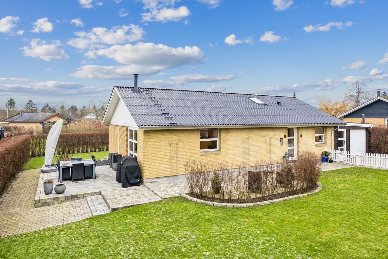 På en lukket villavej i Gelsted ligger en nydelig etplansvilla og venter på sin nye familie. For få år siden blev den opdateret på flere fronter, hvorfor der er gjort klar til, at nøglerne kan skifte hænder, og I kan flytte direkte ind. En pæn forhave, gule mursten, hvide vinduesrammer og et nyt tag fra 2024 møder jer, som I triller ind på adressen. Ja, der er unægteligt styr på det ydre – og det samme gælder indenfor. Bilen kan I parkere i garagen, før I med fordel tager et kig på baghaven. Den er grøn, nem at holde og med fliseterrasser i flere retninger, så I altid kan fange solen. Et udhus tager sig af haveredskaber, krukker og alt det praktiske. Indenfor venter 109 veludnyttede m2: Entréen fik nye fliser i 2024, og samme år blev der lagt nye gulve i hele huset, ligesom døre og karme blev udskiftet. Planløsningen fordeler tre regulære værelser, et brusebadeværelse – også fra 2024 – med gulvvarme samt et åbent opholdsrum, hvor køkken, spisestue og stue glider sammen. Her står en pilleovn, som har fulgt hjemmet de sidste fire år, suppleret af en luft-til-luft varmepumpe fra fem år siden. Bagtil grænser grunden op til et grønt område, og bare 500 meter væk begynder Stenskov med sine stier og udsigter over åbne marker. Svømmehal, idrætsfaciliteter og indkøb nås på cykel, mens skolebussen stopper 100 meter fra hoveddøren. For pendleren er der desuden kort køreafstand til Næstved og Ringsted – og motorvejen ligeså.